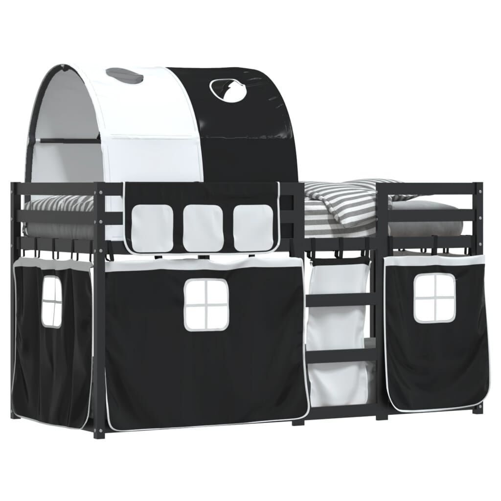 vidaXL Κουκέτα με Κουρτίνες Λευκό/Μαύρο 90x190 εκ. Μασίφ Ξύλο Πεύκου