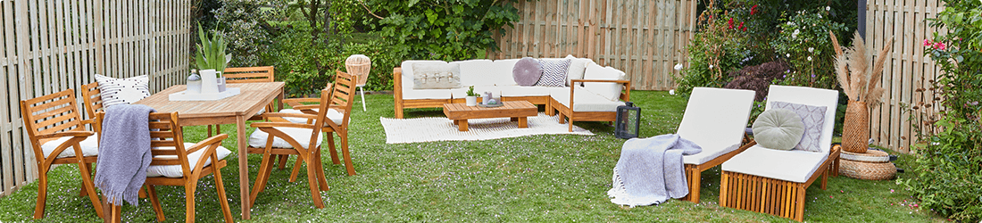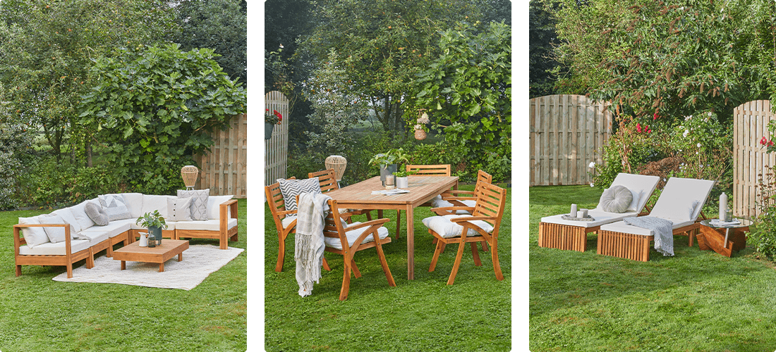 Η ευελιξία των ξύλινων επίπλων κήπου σάς επιτρέπει να τα διακοσμείτε με διάφορους τρόπους. Για παράδειγμα, το σετ τραπεζαρίας κήπου από μασίφ ξύλο teak είναι ιδανικό για να απολαμβάνετε γεύματα σε εξωτερικούς χώρους. Κάντε το πιο άνετο, προσθέτοντας απαλά μαξιλάρια στο αγαπημένο σας χρώμα.